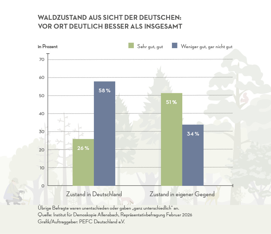 Zum Tag des Waldes am 21. März 2026 hat KOLLAXO im Auftrag von PEFC Deutschland eine repräsentative Bevölkerungsbefragung beim Institut für Demoskopie Allensbach durchgeführt. Das Ergebnis: Die Deutschen sorgen sich um den allgemeinen Zustand des deutschen Waldes, bewerten aber den Wald in ihrer unmittelbaren Umgebung auffallend besser. Bemerkenswert aber ist, dass überall in Deutschland der regionale Wald deutlich besser eingeschätzt wird als der deutsche Wald insgesamt . Die Bayern sind gleichwohl am zufriedensten: 63,6 Prozent erleben vor Ort einen sehr guten oder guten Waldzustand, obwohl auch in Bayern acht von zehn Waldbäumen geschädigt sind. Befragt wurden im Februar 2026 1.052 Personen ab 16 Jahren.